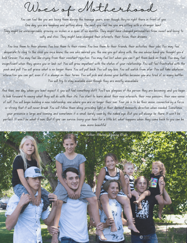 I recently came upon some words written by Whiteney Flemming Write. She describes perfectly the woes of motherhood. The demands of motherhood are great, but the rewards are worth it. I read her words at a time when I really needed to hear them or at least read them.