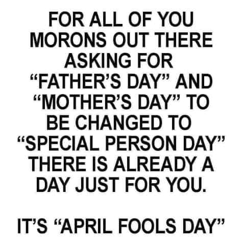 FYI, I do not agree in full with the above meme, more precisely, I do not believe lesbians, gays, trans, etc are designated April Fool’s Day, but I do believe in only two genders: Male and Female.