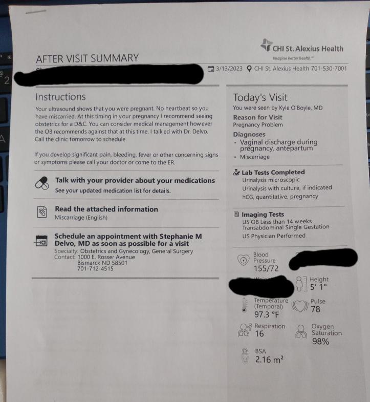 After a short wait, the doctor came back in to deliver the results. There was no movement and no heartbeat. I had miscarried. He told of his surprise that I wasn’t feeling any pain and there was no sign of blood, but said it would happen within the next 24-48 hours. He spoke of my options because at this point the baby inside me was not viable and infection became a concern. My options included (1) medicine to help complete the miscarriage, (2) but due to the point of where the pregnancy was (12 weeks gestation) he recommended a dilation and curretage (D & C). Absolutely not, I said. Again, he mentioned infection as a concern so after speaking with my regular clinic, they would be expecting a call from me the next morning. At around 1:00 a.m. we were released to go home. We would have to deliver the bad news to our children later that day.