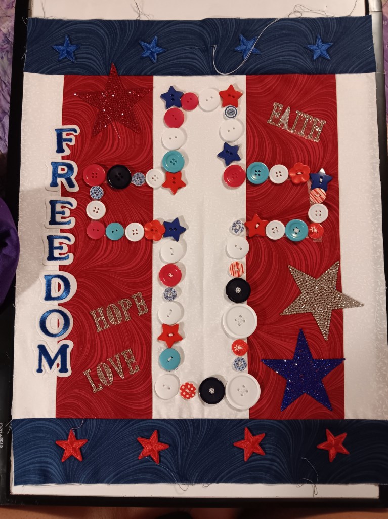 With that inspiration in mind, I began planning my block. I chose a 16×20-inch size, as the guidelines suggest. At its center is a cross made of red, white, and blue buttons, carefully sewn onto a red and white background. This cross represents both my faith and the beautiful unity of America’s colors. Around it, I added red and blue stars—symbols of hope, courage, and patriotism.