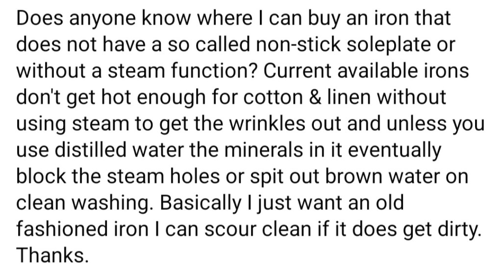I was scrolling through social media the other day — you know, the mindless kind of scrolling where you’re not really looking for anything — when a post stopped me cold. Someone was asking a simple question: Does anyone know where I can find an iron like the old ones? No rubber mat on the base. No distilled water. Just an iron that irons.