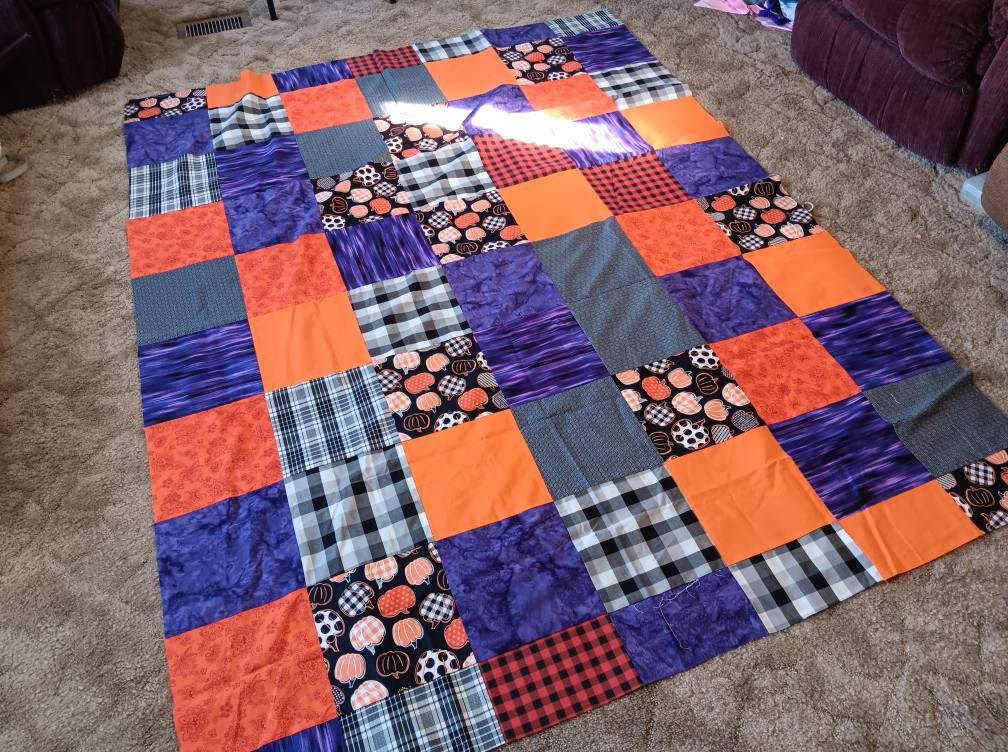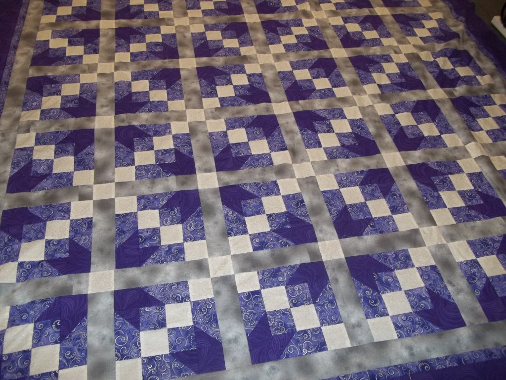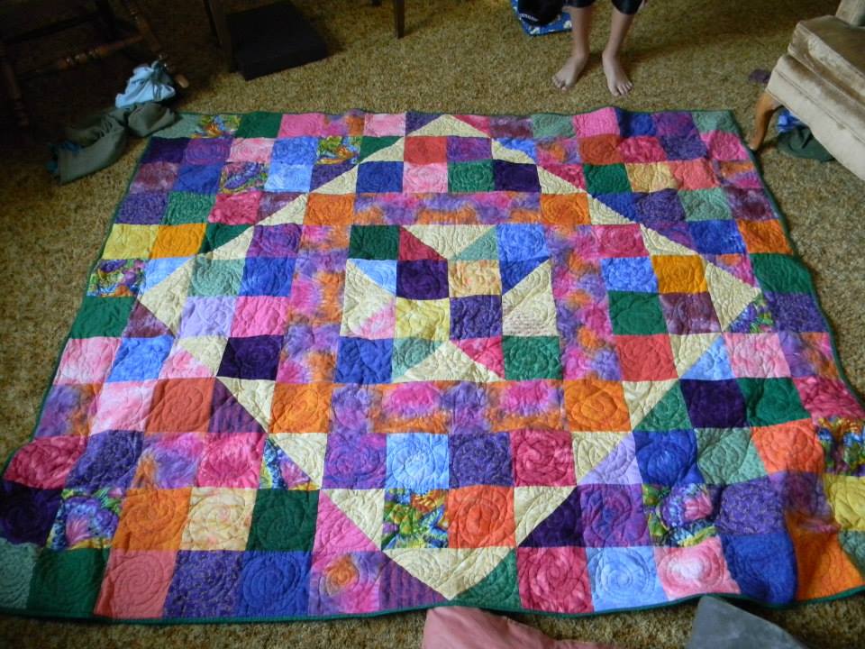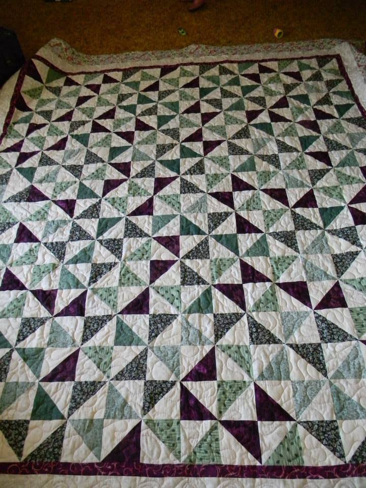 some years ago, we were visiting his parents and my mother-in-law decided it was time for me to make a quilt. being an easy-going person, I just rolled with it. however, in my mind I was thinking ‘this is not a good idea for me.’ you see, back in high school, we had to make a sewing project in home ec. class. I chose a pair of shorts and let’s just say mine didn’t go as planned. but whatev, I went along with the whole quilting project plan. so, when we visited his parents, I’d sit at a table in her kitchen while she cooked, armed with fabric and a sewing machine. she walked me through the entire quilt……from picking the colors to my last stitch on my quilt top. she explained each step and away I went. I can’t remember how long it took, a couple months maybe as I only worked on it when we visited.