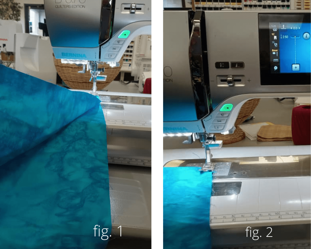 on the bottom open side, still right sides together, sew 1/4″ seam 3″ in from both side seams, leaving a approx. a 10″ opening.